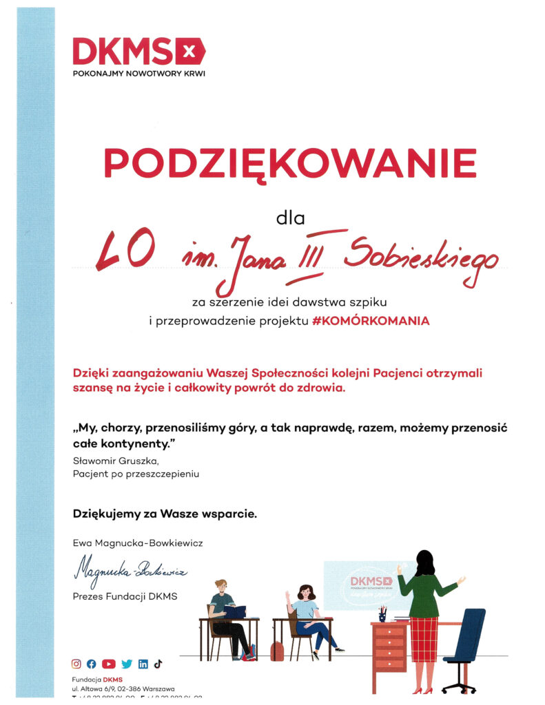 Z radością informujemy, że DKMS przekazała podziękowanie dla LO im. Jana III Sobieskiego za szerzenie idei dawstwa...