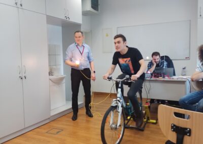 Zwieńczeniem warsztatów było ciekawe i wymagające zadanie – wygenerowanie energii elektrycznej poprzez jazdę na rowerze podłączonym do prądnicy. Celem było zapalenie żarówki o mocy 100 W. Dzięki determinacji i wysiłkowi wszystkim ochotnikom udało się osiągnąć ten cel.