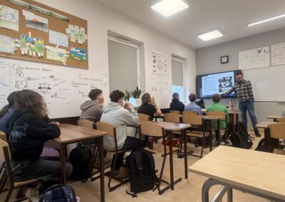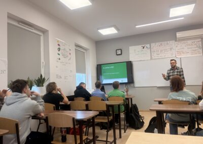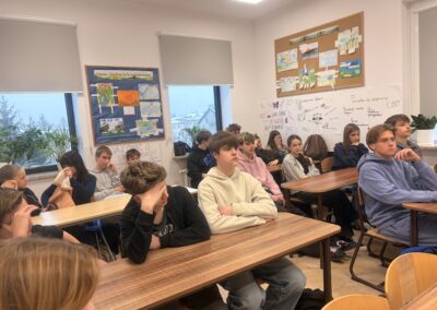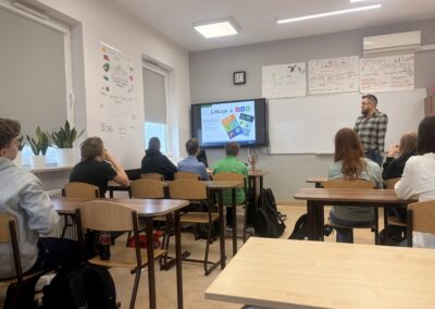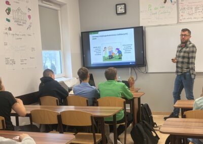 Okazało się, że nasi uczniowie są doskonale zorientowani w tematyce ubezpieczeń społecznych. Chętnie odpowiadali na pytania pana Krzysztofa, wykazując duże zainteresowanie poruszanymi zagadnieniami oraz dobrą znajomość tematu. Spotkanie przebiegało w bardzo przyjaznej atmosferze – pan Krzysztof z humorem, a jednocześnie niezwykle merytorycznie przybliżał uczniom omawiane kwestie.