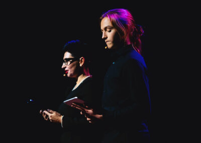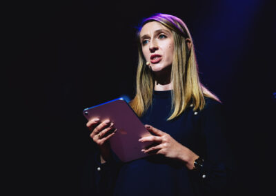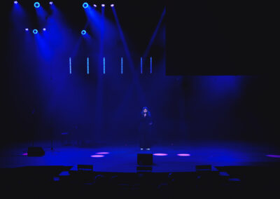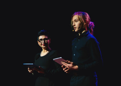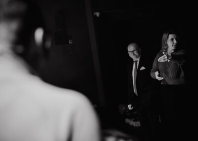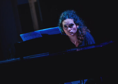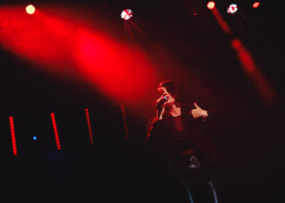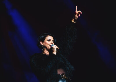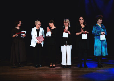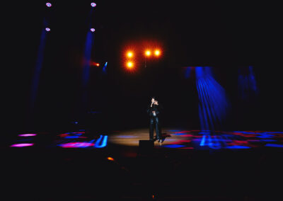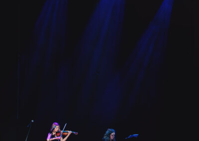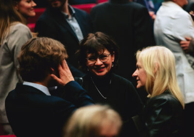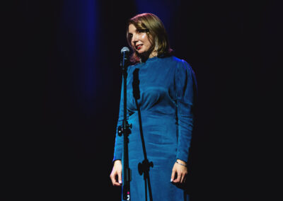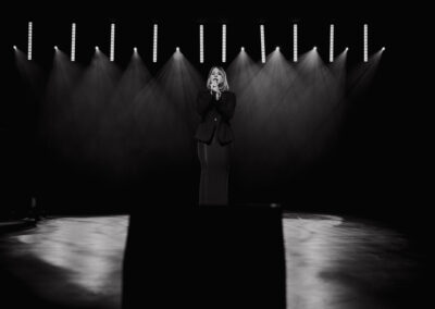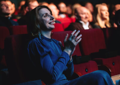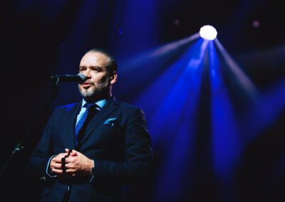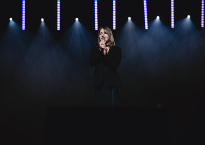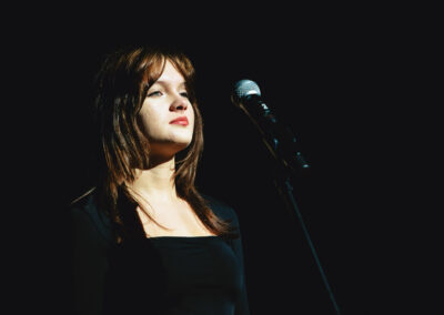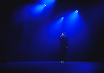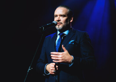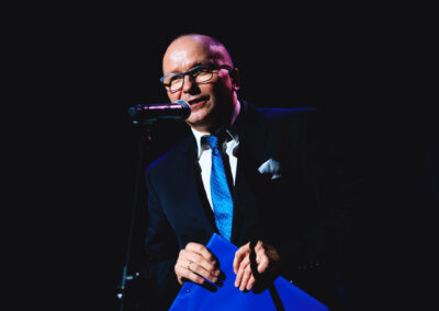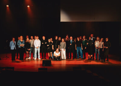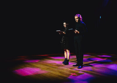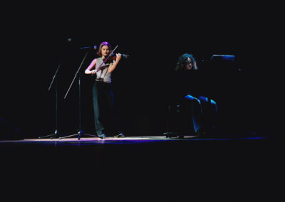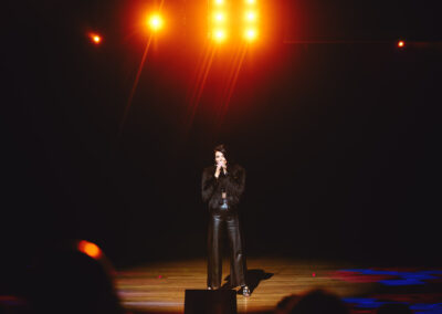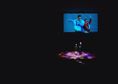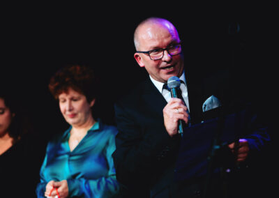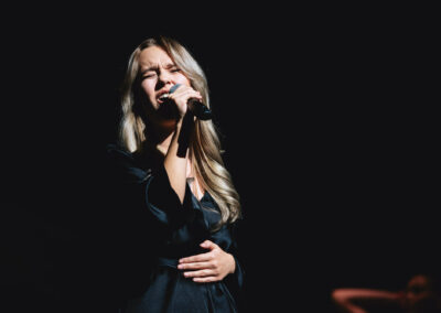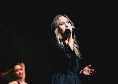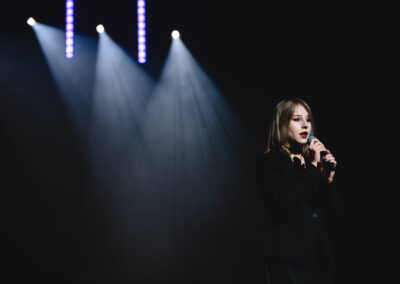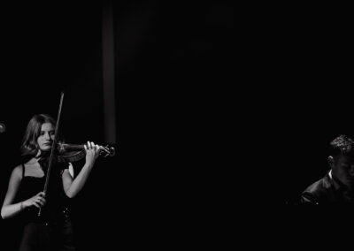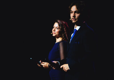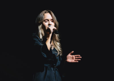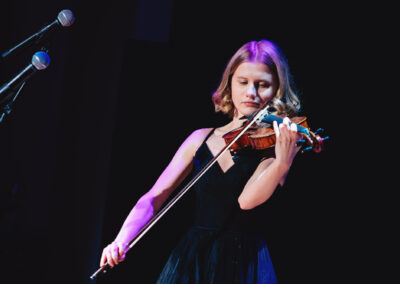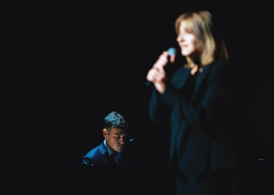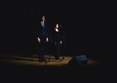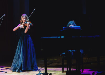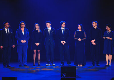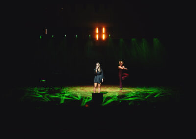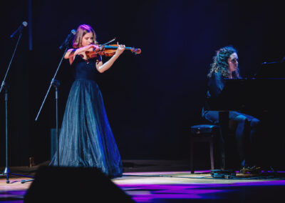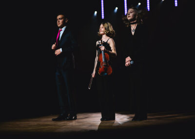 Wieczór muzycznie otworzyła Maja Jaworska, absolwentka szkoły, która wykonała poruszający utwór „Zamigotał świat”. Jej występ uświetniła Zuzanna Kura, uczennica klasy 2b, przepięknym tańcem, który porwał serca uczestników. Ten spektakularny duet był prawdziwą ucztą dla zmysłów, a talent Zuzanny jest czymś absolutnie wyjątkowym. Jesteśmy dumni, że zgodziła się wziąć udział w naszym jubileuszowym przedsięwzięciu, wzbogacając je o swój niepowtarzalny kunszt artystyczny. W dalszej części programu zaprezentowało się trio Maja Celińska, Michalina Kajdzik i Mateusz Goliszek z piosenką „Lovely”, która wzbudziła entuzjazm publiczności. Wyjątkowym momentem był duet uczennicy Michaliny Kajdzik (skrzypce) i pani Natalii Zanni-Lewandowskiej (fortepian), który podkreślił znaczenie współpracy uczniów i nauczycieli w rozwijaniu talentów.