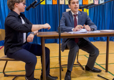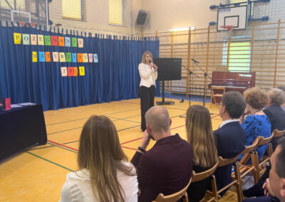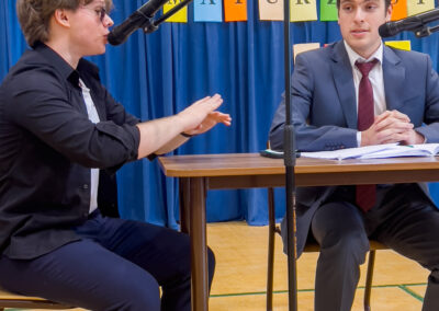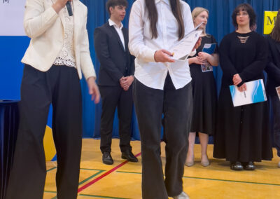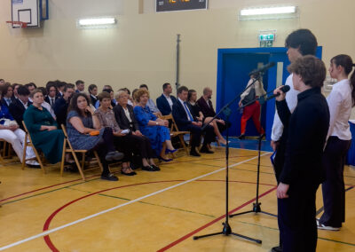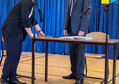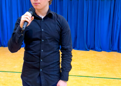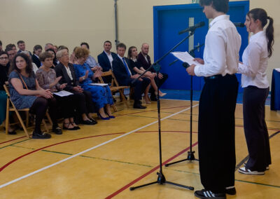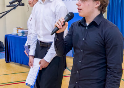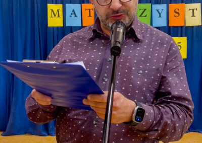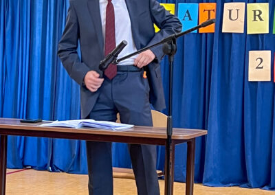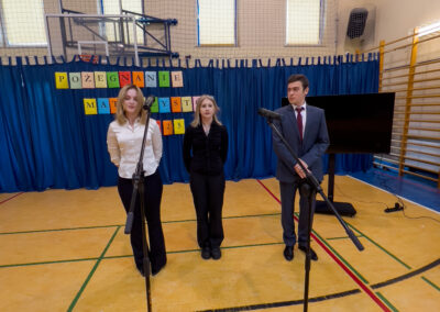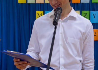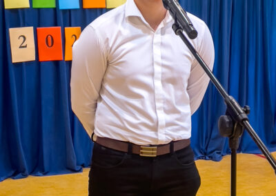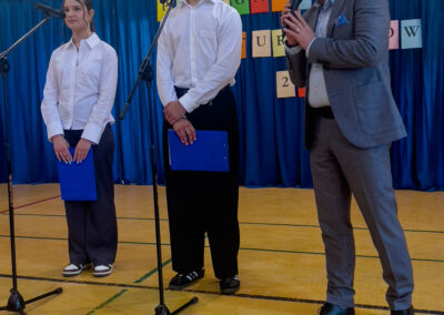 W imieniu całej społeczności uczniowskiej głos zabrał Przewodniczący Samorządu Uczniowskiego, Jakub Samborski. W swoim przemówieniu z ciepłem i wdzięcznością pożegnał kolegów i koleżanki z klas IV, życząc im odwagi, wiary w siebie i powodzenia na kolejnych etapach życia.