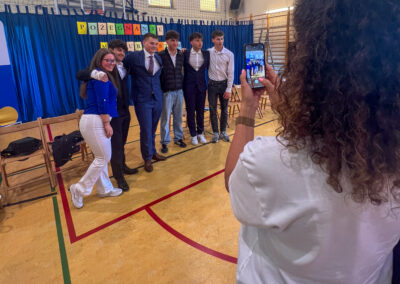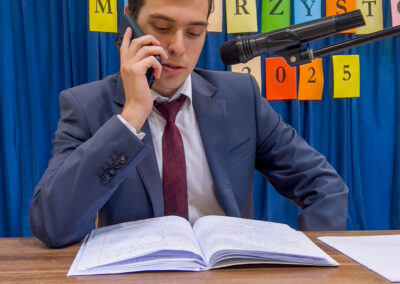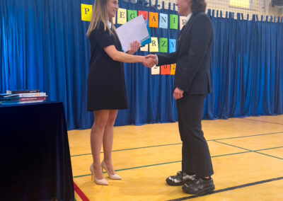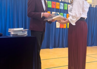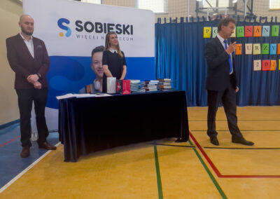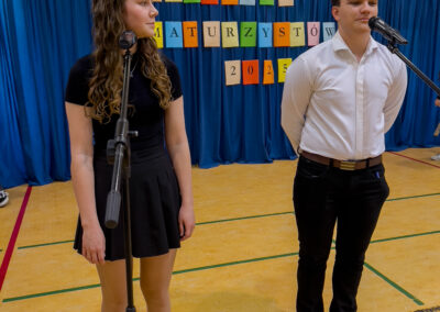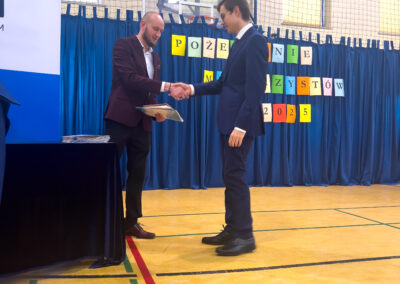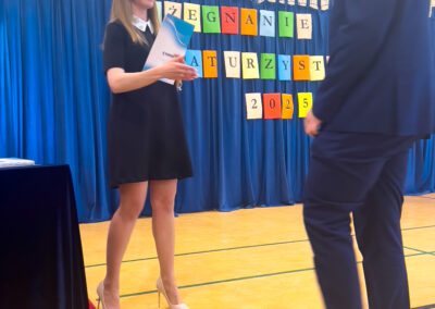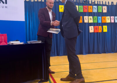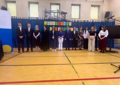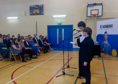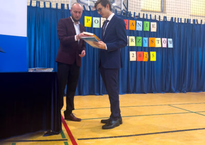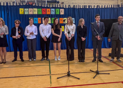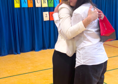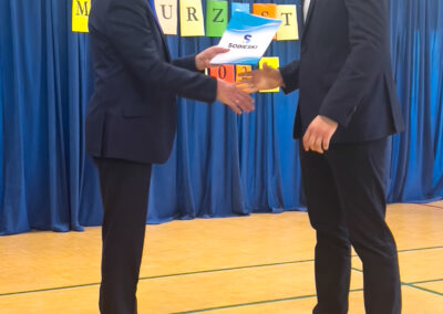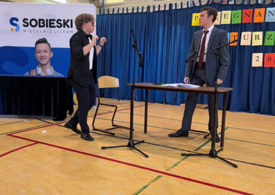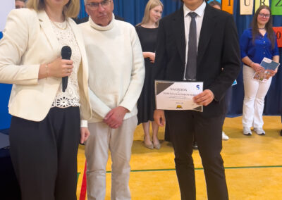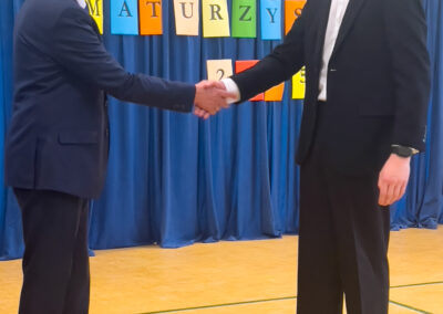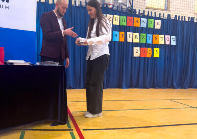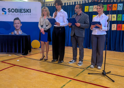 Po wystąpieniach rozpoczęła się najbardziej wzruszająca część uroczystości – wręczenie świadectw ukończenia szkoły, połączone z oficjalnym pożegnaniem absolwentów przez ich wychowawców: pana Marka Goliszka, panią Katarzynę Buczek oraz pana Grzegorza Zawadzkiego. Wychowawcy wspominali wspólną drogę, podkreślając, że choć nie zawsze było łatwo, a uczniowie potrafili zaskakiwać grono pedagogiczne coraz to nowszymi i bardziej kreatywnymi pomysłami, to właśnie te momenty budowały wyjątkową więź, zaufanie i prawdziwą społeczność. Przypomnieli, że drzwi Sobieskiego zawsze będą dla absolwentów otwarte – bo Sobieski to nie tylko szkoła, ale wspólnota, do której można wracać.